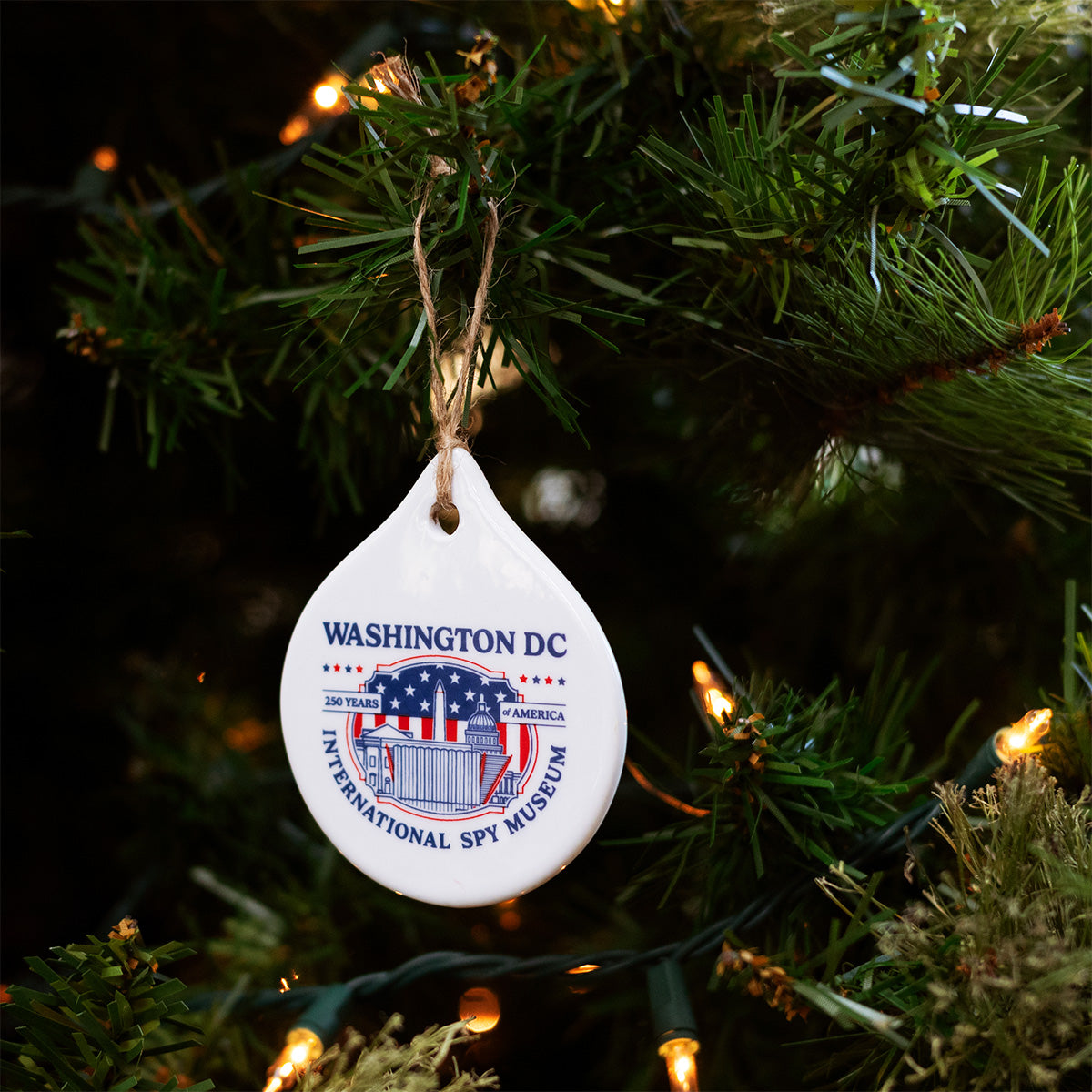 Ceramic Ornament illustrates the White House, the Capital, the Washington Monument and the SPY Museum. SPY (and hang!) with us to celebrate America's 250 years!