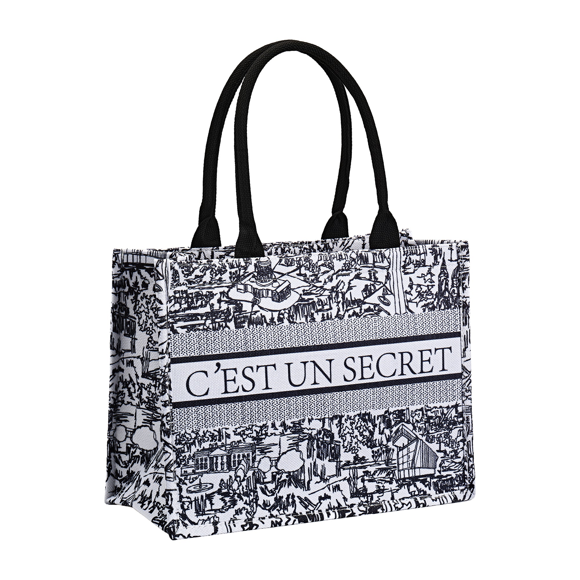 C'est Un Secret : It is a Secret. Our trendy tote bag is made of sturdy canvas and cleverly illustrates the SPY Museum, the Whte House, the Washington Monument and the Capitol Building in an obscure background. Hidden in plain sight. There is an 11-inch zip flap to partially conceal your bag's unspoken contents. The light interior lining has an inner zip pocket to quickly conceal your phone, wallet or secret notes. The tote bag is white and black print. 15in (long) X 6.5in (wide) X 11.5in (tall).