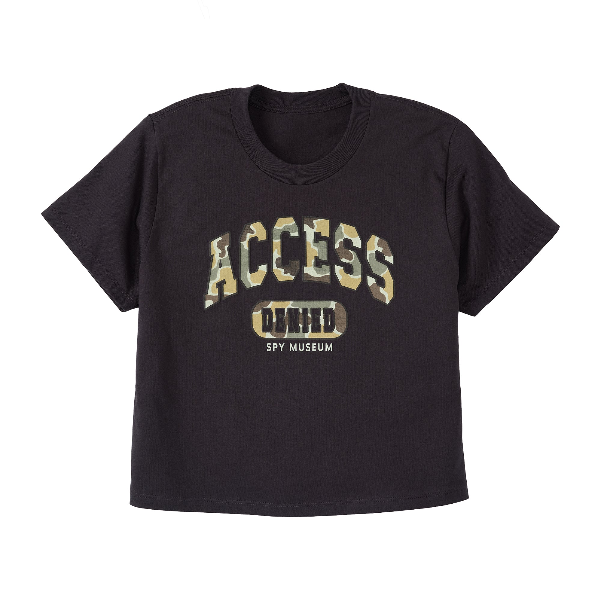 Black tee with playful Access Denied phrase in a classic green camouflage print, with outline of words in black puff ink for a textured feel. Boxy silhouette that hits just above waist. Fabric content: 100% cotton. Care instructions: machine wash cold, tumble dry low, do not iron decoration. Made in Nicaragua.