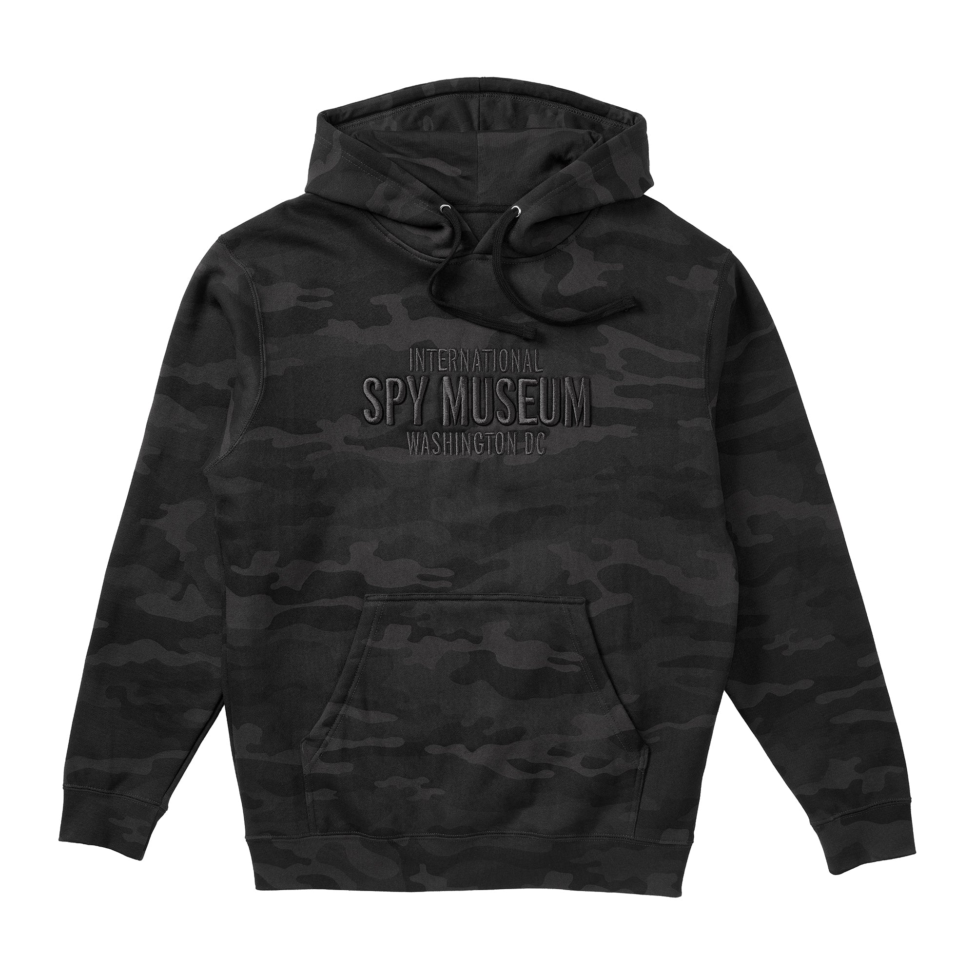 Black tonal camo fleece hoodie with black thread embroidery on front. The words SPY MUSEUM are in a high-quality puff embroidery for an elevated look and feel. Fabric content: 80% cotton, 20% polyester. Care instructions: machine wash warm, normal cycle, tumble dry low, do not iron decoration. Made in China.