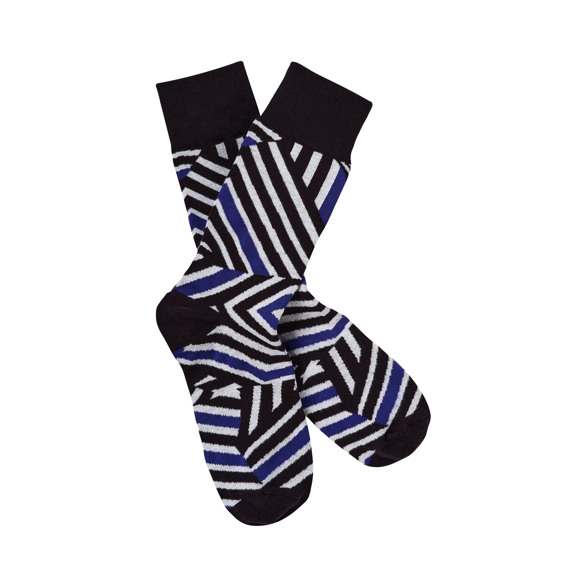 Show off your knowledge of all things camouflage with these dazzle camouflage socks. The dazzle camouflage pattern, which consisted of bold contrasting colors and complex patterns of geometric shapes, was used extensively by the British and American navies in World War 1 as an innovative measure to protect their ships from German torpedo attacks. These stunning patterns and colors were meant to confuse the enemy about a ship's speed and direction. By the end of the war, more than four thousand ships had been painted with these mesmerizing designs. Adult sizing, one size fits most. Fabric content: 70% cotton, 28% polyester, 2% elastic. Care instructions: machine wash cold, inside out, tumble dry low. Made in China.