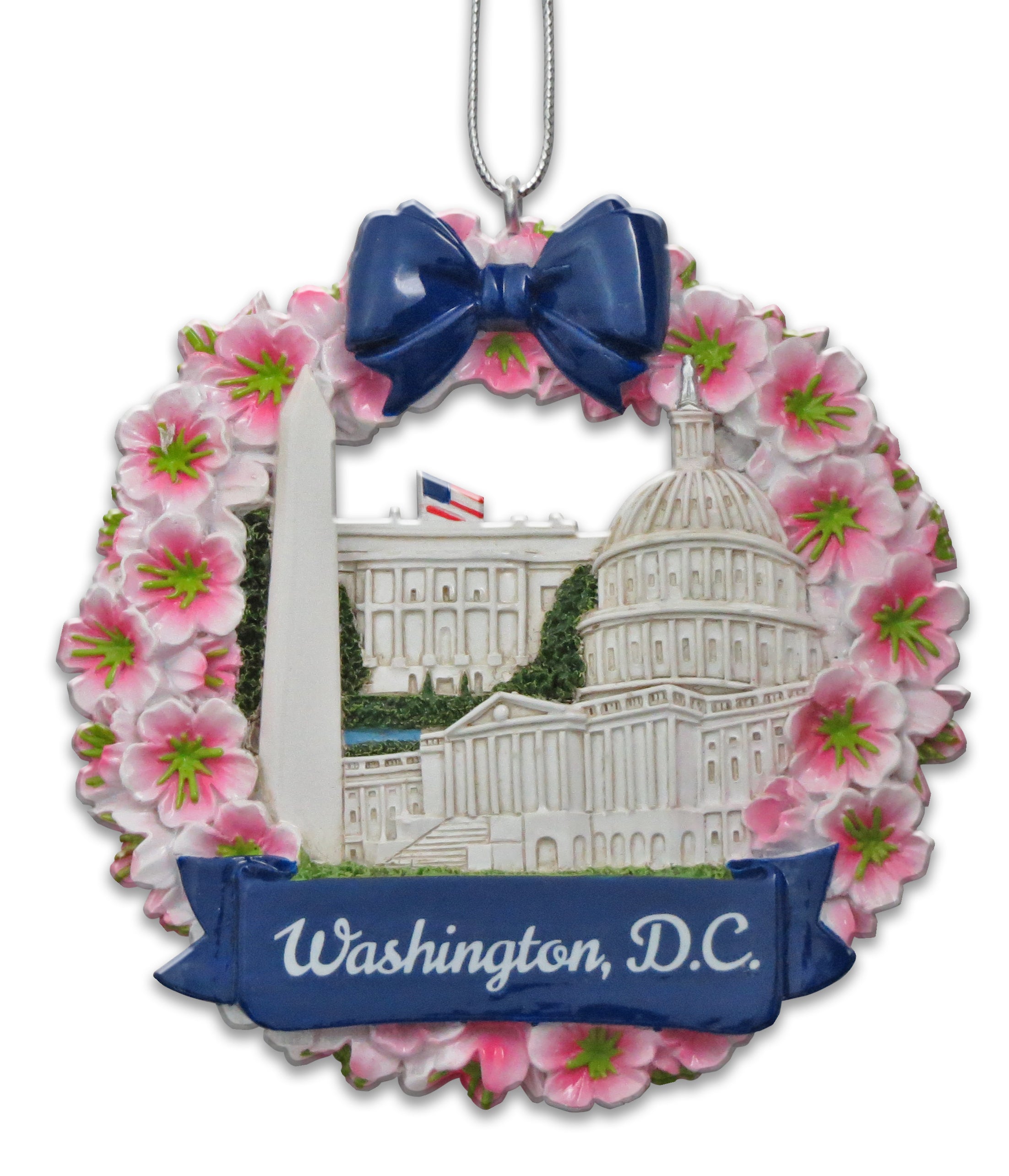Cherry blossom wreath ornament with dark blue Washington DC ribbon at bottom and DC monuments in center. Polyresin composition.
